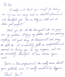 Thank you for all the time spent with me going over my questions, studying my photos, not over-promising anything and just being so transparent and easy to talk to. I immediately felt so comfortable and assured in having you as my surgeon, and am so incredibly thankful I ran across your work.