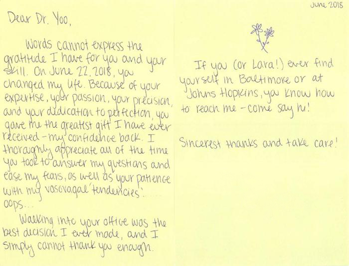 5.0 stars - Written on July 17, 2016Dr. Yoo, I never had a real chance to thank you for what you did for me. I’m so glad I Googled your name on a whim just now. As you know, I wasn’t certain about the outcome of my procedure at the time you moved. You should have shook me & said “just wait!” Lol. You changed my life. I gained so much strength & confidence because of your skills & generosity. Bless you for seeing in me what I could not see in myself. Hope you receive this message & know how grateful I am! Thank you so very much Dr.Yoo!