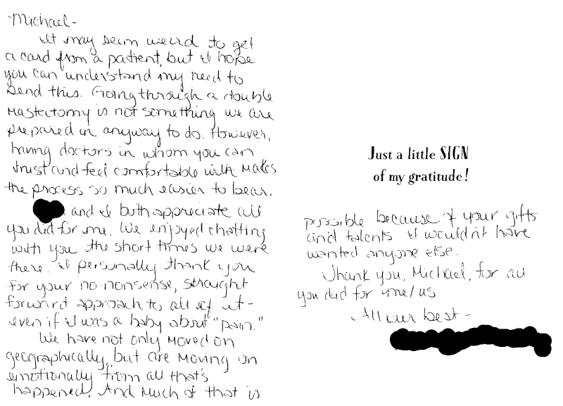 It may seem weird to receive a card from a patient, but I hope you can understand my need to send this. Going through a double mastectomy is not something we are prepared in any way to do. However, having doctors in whom you can trust and feel comfortable with can make the process so much easier to bear.